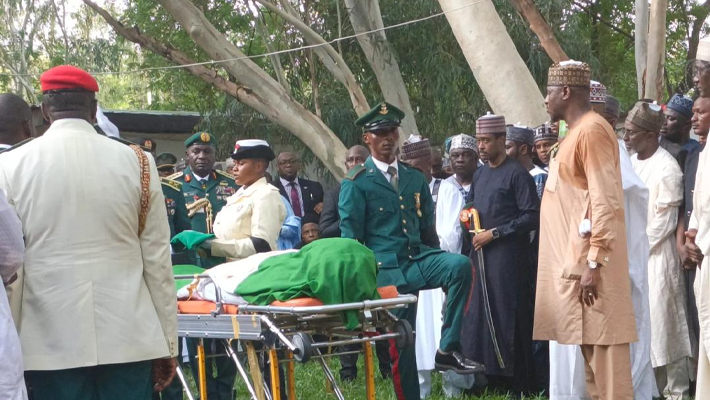 The revered statesman’s body had arrived in Katsina earlier on Tuesday, flown from London where he passed away on Sunday, July 13, 2025, at the age of 82 after a prolonged illness. A Nigerian Air Force aircraft conveyed his remains, accompanied by Vice President Kashim Shettima and other senior government officials, to the Umaru Musa Yar’Adua International Airport. From there, the national-draped casket was transported by helicopter to Daura, a journey witnessed by thousands of well-wishers lining the routes.