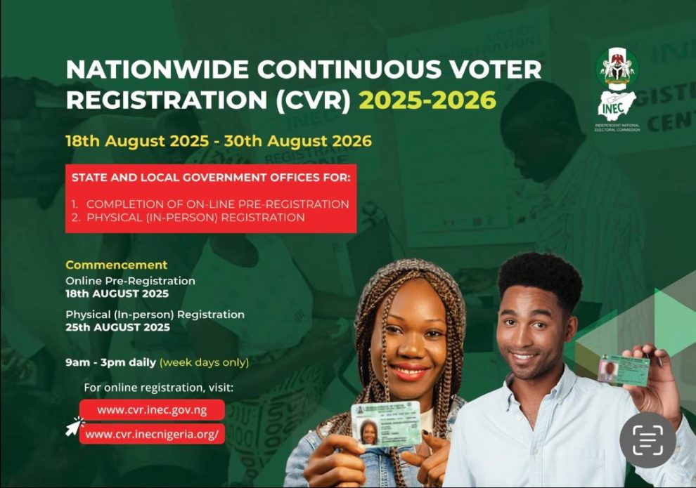 Abuja, Nigeria – Nigeria’s Independent National Electoral Commission (INEC) is set to resume its Continuous Voter Registration (CVR) exercise nationwide, beginning on August 18, 2025. The commission announced that the exercise will be held for one year and is introducing new tools to make the process more accessible to citizens.