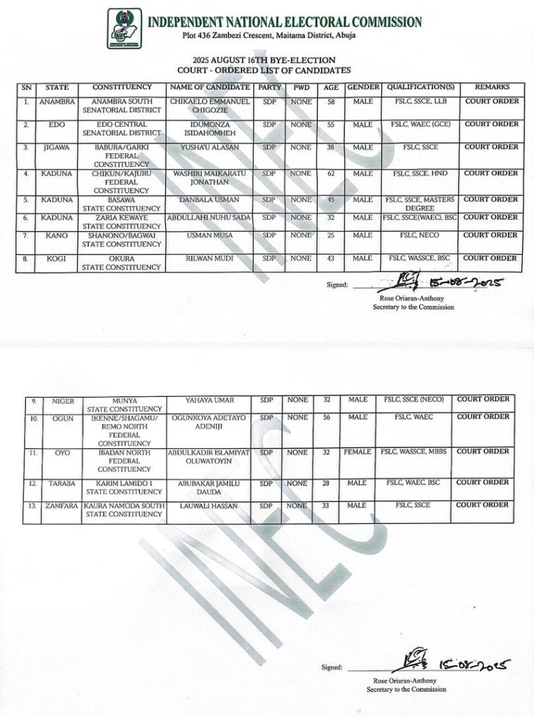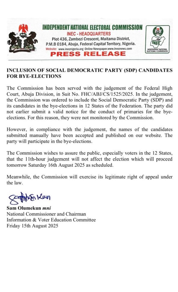 Abuja, Nigeria – The Independent National Electoral Commission (INEC) has announced it will include candidates from the Social Democratic Party (SDP) in bye-elections scheduled for Saturday, following a court order. The party was previously excluded after failing to submit a valid notice for its primaries.