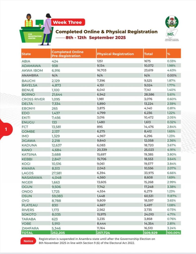 For completed registrations, which combine both online pre-registration and physical sign-ups, the total stood at 509,929 as of Friday, 12 September 2025. Here, the gender gap is wider, with women accounting for nearly 55% of the total (280,171) against men at just over 45% (229,758). The trend of youth engagement is even more pronounced in this category, with young people aged 18 to 34 making up over 74% of completed registrations (378,132), and students representing almost 39% (196,529). The statement was signed by Sam Olumekun, the National Commissioner and Chairman of the Information and Voter Education Committee.