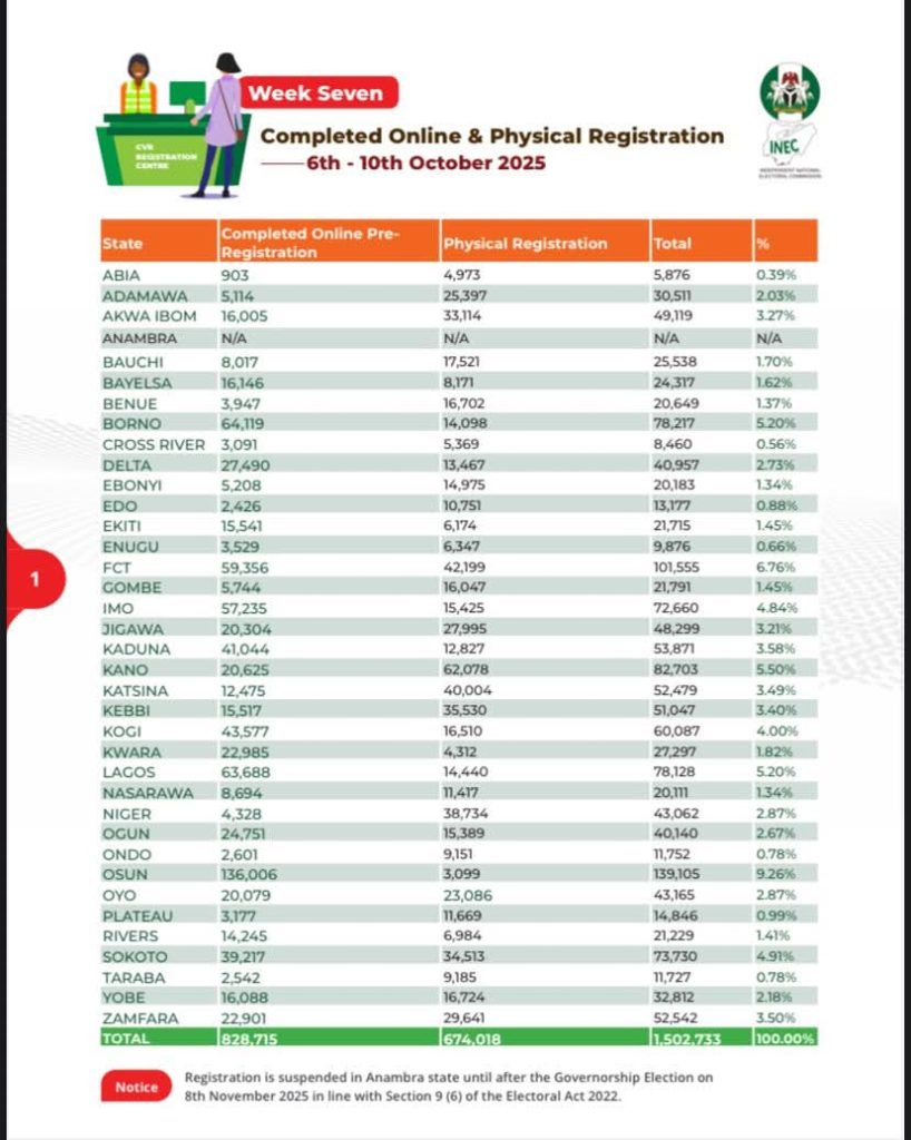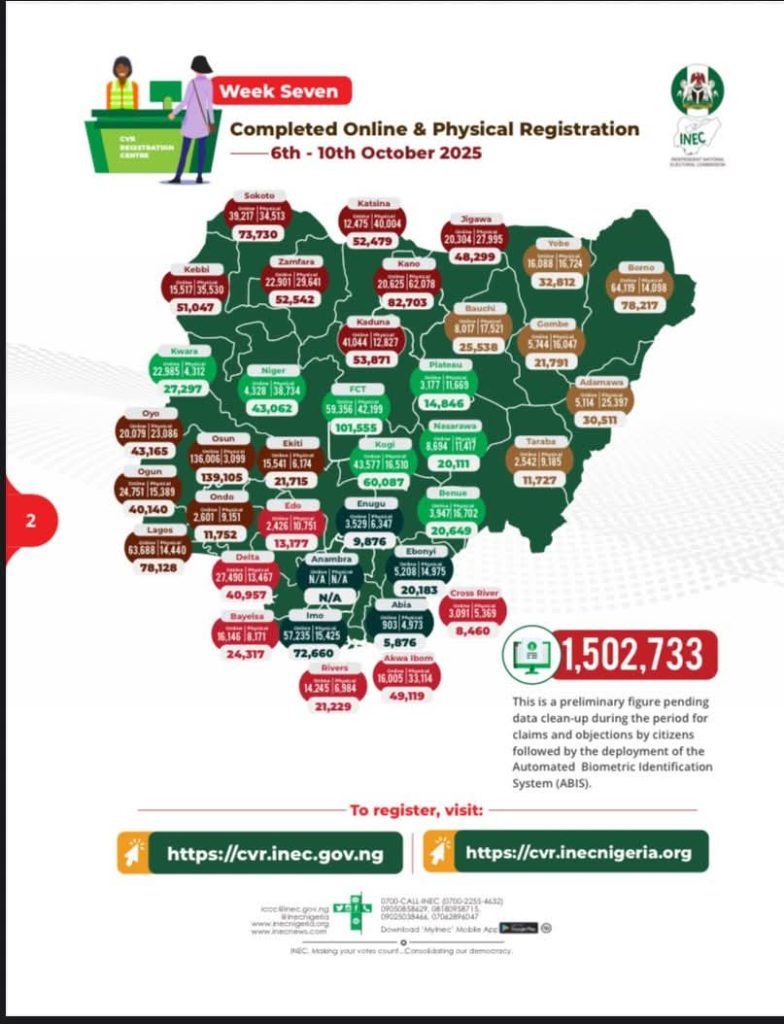 Nigeria’s ongoing drive to register new voters has logged over 1.5 million completed registrations, according to the latest figures released by the country’s electoral body.