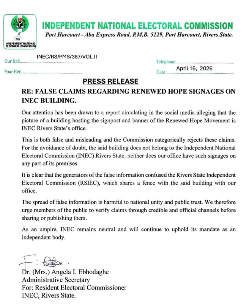 The Independent National Electoral Commission (INEC) issued a “categorical rejection” on Thursday of reports claiming that its Rivers State office in Port Harcourt was hosting banners for the “Renewed Hope Movement”—the political brand associated with the current administration.