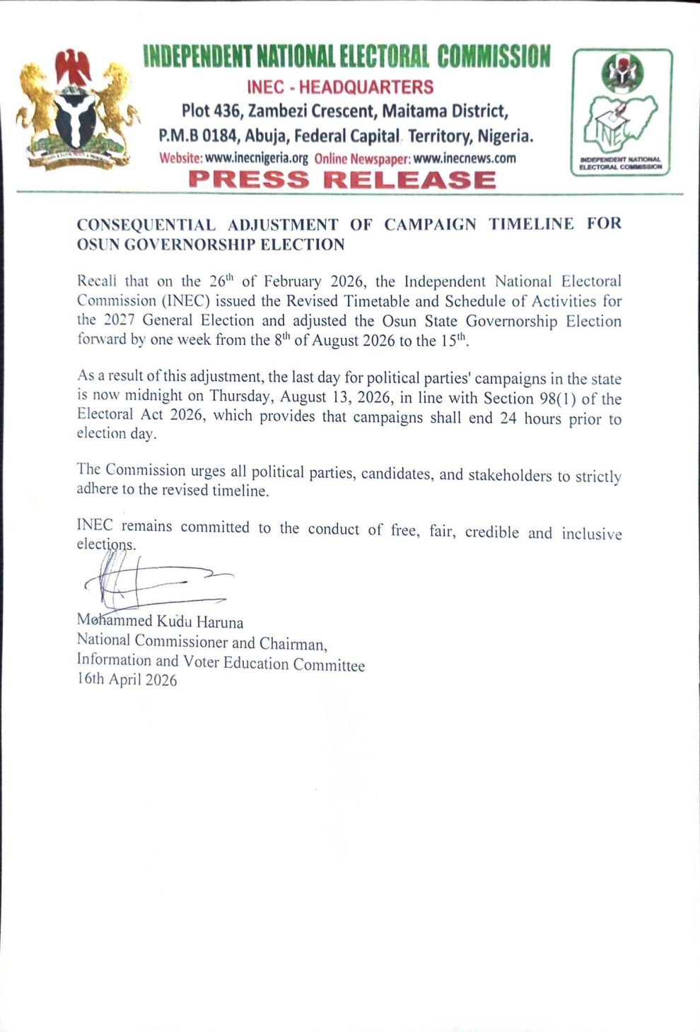 Nigeria’s electoral umpire has announced a mandatory adjustment to the campaign schedule for the upcoming Osun State governorship election, following a wider reshuffle of the 2027 national roadmap.